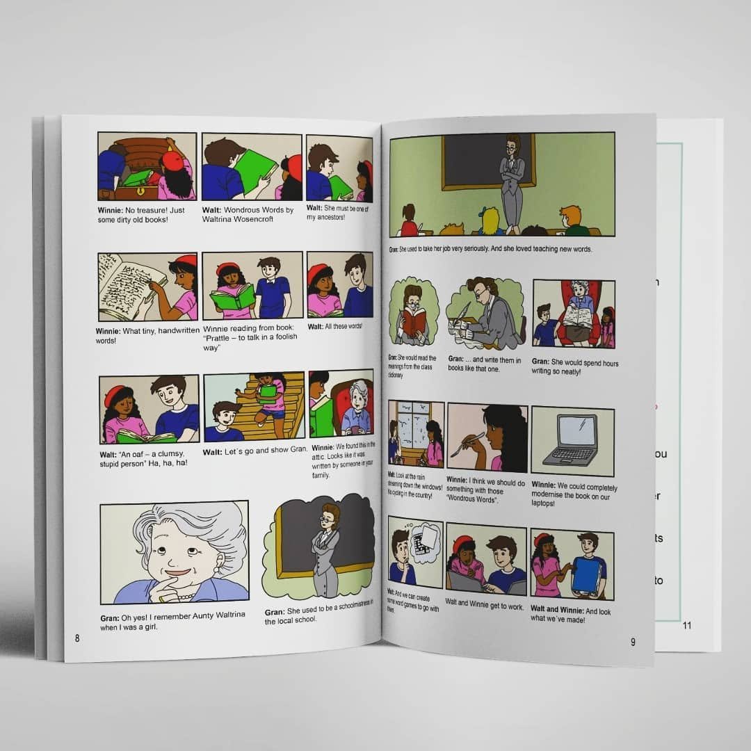 Walt and Winnie’s Wondrous Words is a book designed to help children develop a richer English vocabulary with confidence and enjoyment. It is aimed at students from 10 to 13 mainly, but of course some older children will enjoy it too! It introduces 500 carefully chosen words, presented through Walt and Winnie and their adventures that make learning words meaningful and memorable.